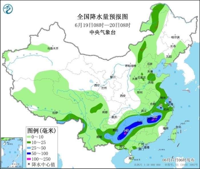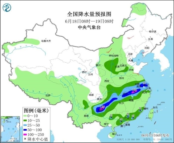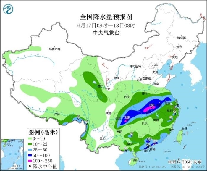 17日至19日,西南地區(qū)東部、江漢、江淮、江南、華南等地有大范圍較強(qiáng)降雨過程,部分地區(qū)有大到暴雨,局地大暴雨,并伴有短時強(qiáng)降水、雷暴大風(fēng)等強(qiáng)對流天氣。其中,6月17日08時至18日08時,江淮大部、江漢大部、湖南北部、重慶中東部、貴州北部、廣西北部和南部沿海、廣東中南部、福建南部以及西藏東南部、云南西北部等地部分地區(qū)有大到暴雨,其中,湖北東部、重慶東南部、貴州東北部、廣東中南部等地部分地區(qū)有大暴雨(100~150毫米)。上述部分地區(qū)伴有短時強(qiáng)降水(最大小時降雨量20~60毫米,局地可超過70毫米),局地有雷暴大風(fēng)等強(qiáng)對流天氣。中央氣象臺6月17日06時繼續(xù)發(fā)布暴雨藍(lán)色預(yù)警。