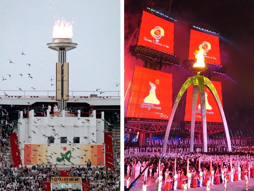 左圖:1990年9月22日,第十一屆亞運(yùn)會(huì)開幕式在北京工人體育場(chǎng)舉行。