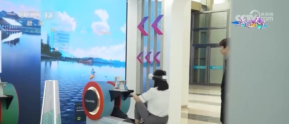 在5G和實時云渲染技術的支持下,配合劃船機和VR眼鏡,在主媒體中心就能實現(xiàn)“泛舟西湖”,沉浸式觀賞晴天、雨天等不同天氣情況下,西湖從斷橋到雷峰塔的沿湖美景。并列的兩臺劃船機還可以聯(lián)機比賽,讓體驗者在西湖美景中享受運動和VR競技帶來的樂趣。