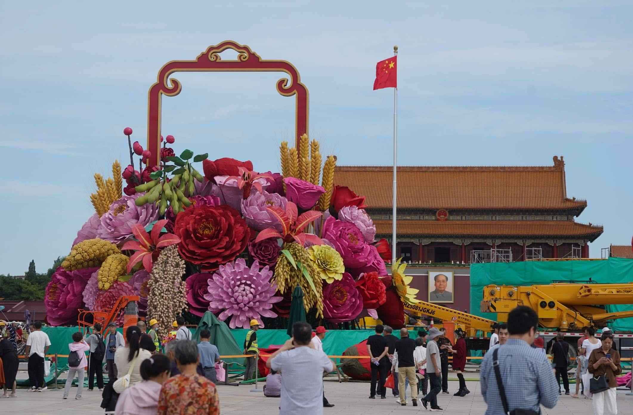 今年,天安門廣場(chǎng)中心的“祝福祖國(guó)”主題花壇以喜慶的花籃為主景。籃內(nèi)選取了擁有美好寓意的花卉和喜慶豐收的五谷(水稻、小麥、小米、黃米、大豆),體現(xiàn)花團(tuán)錦簇、五谷豐登。