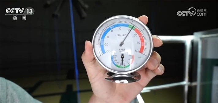 我現在是在氣膜倉的頂部,此刻倉外的溫度是30℃左右,我們再到倉內看一下。一進來就感覺倉里邊一股涼氣襲人,我們來看這個溫度計上顯示此刻的溫度大概是在22℃,也就是說倉內外的溫差有8℃左右,保溫性能還是非常明顯的。
