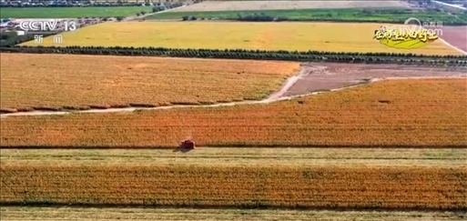 從和田市吉亞鄉(xiāng)上空俯瞰,沃野千里,一片金黃,一臺臺收割機正在忙著收玉米。今年,當?shù)厥状瓮度肴詣哟笮陀衩资崭顧C,可以做到收割、剝皮、去芯、分離、脫粒一氣呵成,一次可以收割十四行玉米,大大提高了作業(yè)效率。