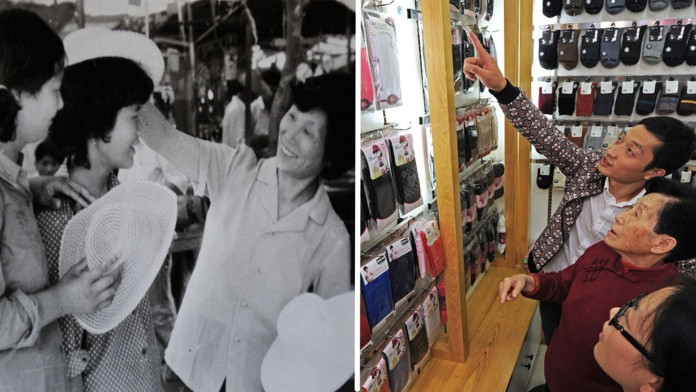 ↑拼版照片,左圖為:義烏小商品市場第一代經(jīng)營戶馮愛倩(右)在向顧客推銷遮陽帽(攝于上個(gè)世紀(jì)80年代);右圖為:2018年10月25日,78歲的馮愛倩(中)在傾聽她的孫子、義烏國際商貿(mào)城經(jīng)營戶楊帆(上)介紹他自產(chǎn)自銷的新款襪子。楊帆大學(xué)畢業(yè)后當(dāng)上了父親創(chuàng)辦的襪業(yè)公司的總經(jīng)理。