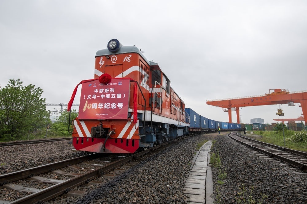 ↑2023年4月23日在義烏西站拍攝的“義烏-中亞五國10周年紀(jì)念號(hào)”中歐班列。