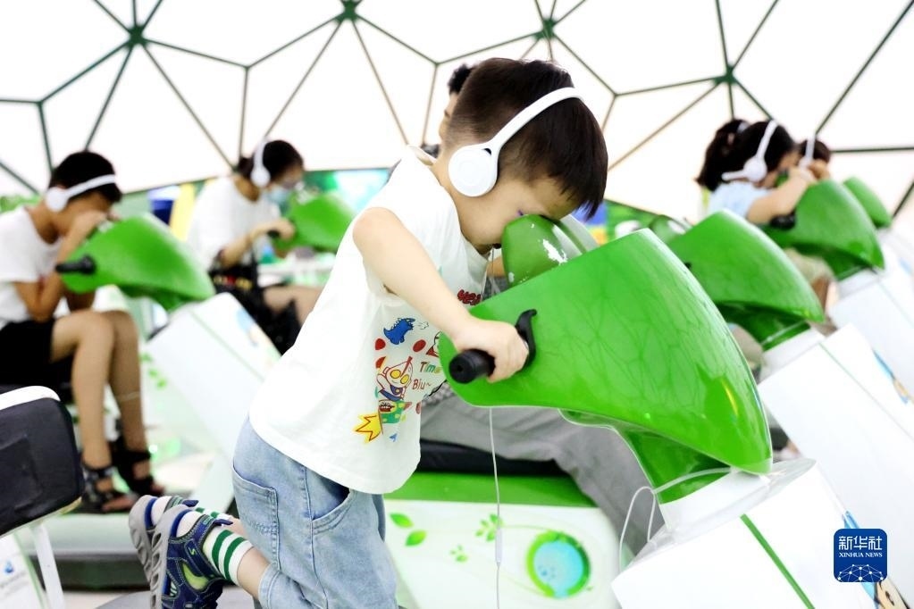 7月8日,兒童在中國杭州低碳科技館參觀體驗(yàn)。
