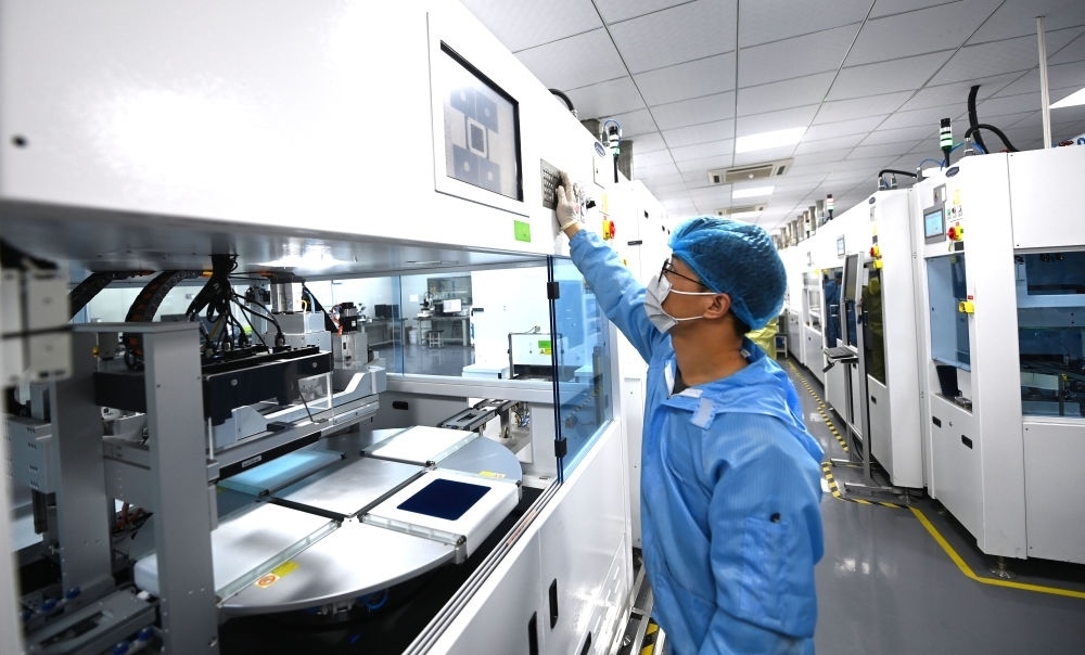在杭州市富陽區(qū)春江街道富春灣新城的杭州正銀電子材料有限公司的研發(fā)實驗室內(nèi),自動化設(shè)備在進行光伏板的絲網(wǎng)印刷(3月22日攝)。新華社記者 徐昱 攝