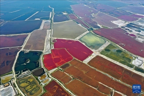 夏日時(shí)節(jié),隨著氣溫不斷升高,山西運(yùn)城鹽湖呈現(xiàn)出色彩斑斕的景象。從空中俯瞰,猶如天然“調(diào)色盤”。
