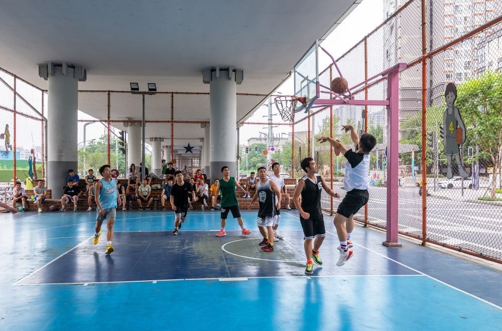 2022年6月12日,年輕人在成都市府青路立交下的運(yùn)動(dòng)空間打籃球。新華社發(fā)(杜寧攝)