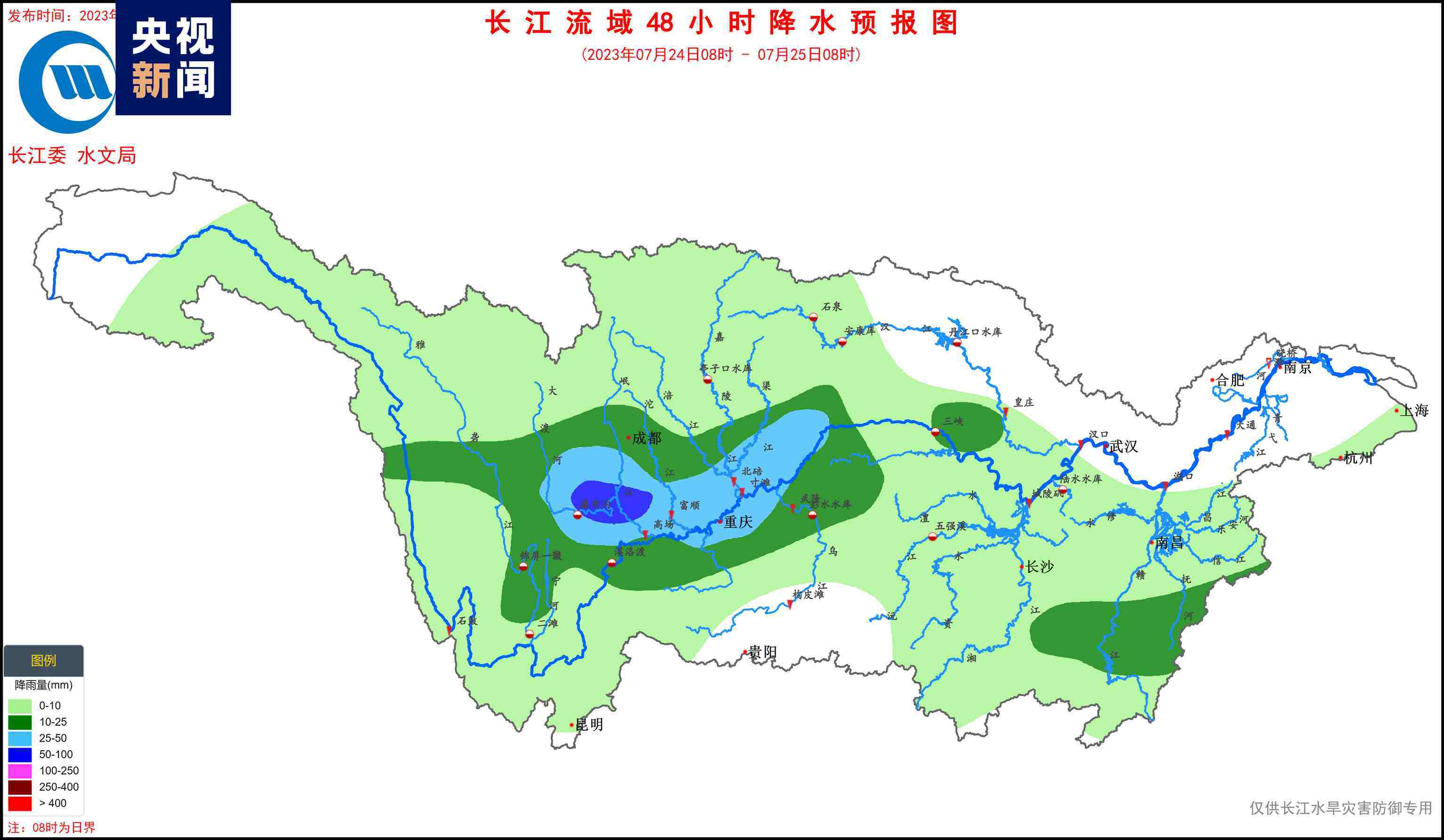 據(jù)水文氣象預(yù)報(bào),7月23日,嘉岷流域北部有中雨、局地大雨;24~27日,長江上游干流附近有中到大雨、局地暴雨的降水過程,過程累計(jì)面雨量:長江上游干流70毫米,金沙江中下游、雅礱江、岷沱江、渠江、烏江上游30~50毫米??紤]預(yù)見期降雨,金沙江中下游、嘉岷流域、赤水河、烏江、三峽區(qū)間將發(fā)生漲水過程,降雨落區(qū)內(nèi)部分中小河流可能發(fā)生超警洪水,局部強(qiáng)降雨引發(fā)山洪災(zāi)害的風(fēng)險(xiǎn)高。