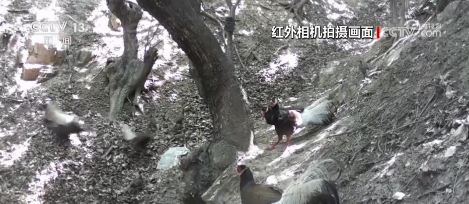 近日,在山西呂梁的孝義市國有林場,紅外相機(jī)記錄到國家一級保護(hù)野生動(dòng)物褐馬雞最大種群。畫面中,先是兩群褐馬雞在兩棵老樹下覓食玩耍,兩個(gè)樹洞內(nèi)積有雨水,它們不斷地前往飲水補(bǔ)給。突然,一只落單的成年褐馬雞入侵,遭到領(lǐng)地一只雄性褐馬雞的追逐驅(qū)趕。不同角度的紅外相機(jī)還捕捉到褐馬雞好奇對視相機(jī)、幼崽上樹打鬧等趣味十足的珍貴影像。
