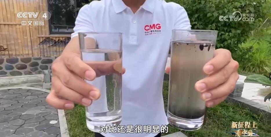 農(nóng)污管理技術員 韋星任:這邊有三個杯子。首先,這杯水是處理之前的,你可以對感受一下,這個是生活污水。第二個杯子里就是我們終端出水。
