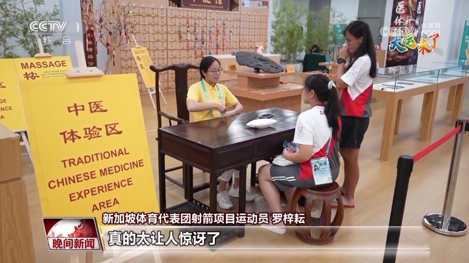 走在大運村里面,在很多地方都可以看到一些中醫(yī)文化的元素。比如在這個中醫(yī)體驗區(qū)里就可以了解中醫(yī)古籍,還能感受按摩,甚至能夠在這里進(jìn)行把脈問診,所以這個區(qū)域也吸引了很多代表團(tuán)成員和運動員到這里來體驗。