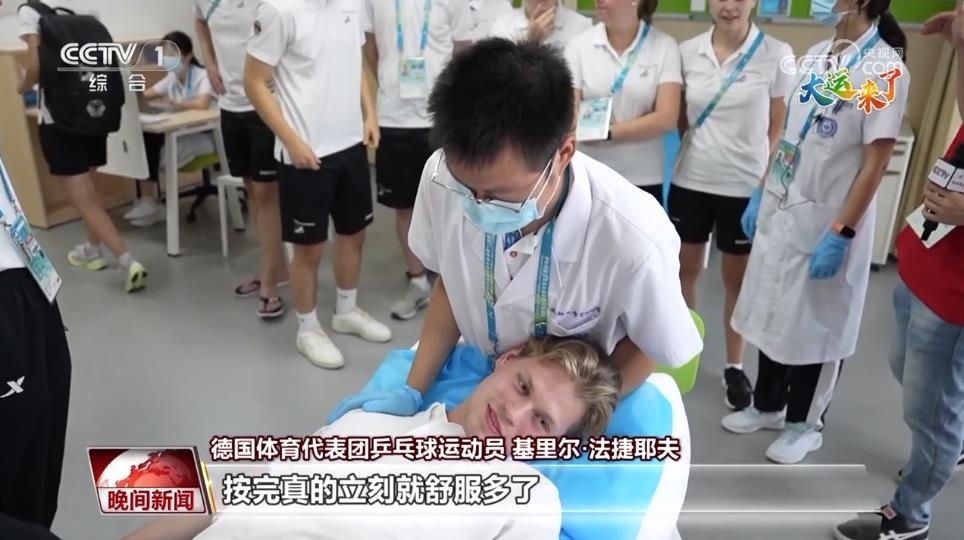 德國體育代表團(tuán)乒乓球運動員 尼爾斯·霍邁爾:不敢想象在大運村還有這么好的醫(yī)療服務(wù),之前完全沒想到。在德國也有一些診所提供類似服務(wù),但能在這里感受一手的中醫(yī)康復(fù)服務(wù),真的太酷了。