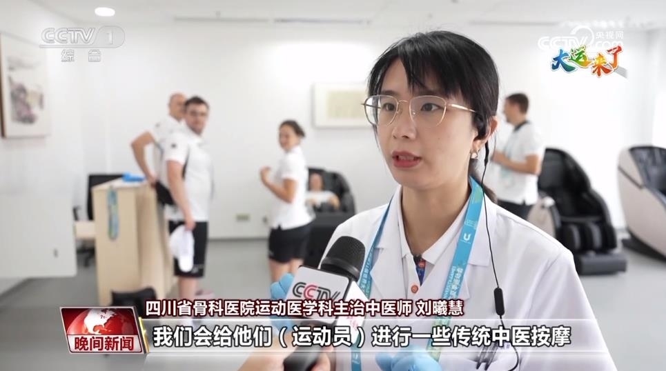 四川省骨科醫(yī)院運動醫(yī)學(xué)科主治中醫(yī)師 劉曦慧:我們會給他們(運動員)進(jìn)行一些傳統(tǒng)中醫(yī)按摩,還有一些特殊的穴位和特殊的治療方法。除此之外,我們還有一些傳統(tǒng)的針灸拔罐,針對性地對他們進(jìn)行一些治療和預(yù)防。