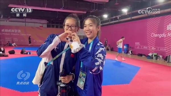 成都大運會,是青春的盛會,也是一次友誼的盛會。來自世界各國的大學生們,一起競技,一起生活。他們交流著彼此的運動技巧,同時也交流著彼此的文化和觀點。正在中國地質大學就讀的跆拳道運動員羅妙溢,在成都大運會中遇到了自己的偶像——東京奧運會跆拳道女子49公斤級冠軍、泰國選手班妮巴。在自己不比賽的時候,羅妙溢會專門來給班妮巴加油。