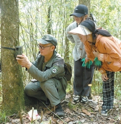 四川大相嶺大熊貓野化放歸研究基地巡護(hù)員在安裝調(diào)試紅外線(xiàn)相機(jī)。楊?lèi)?ài)玲攝