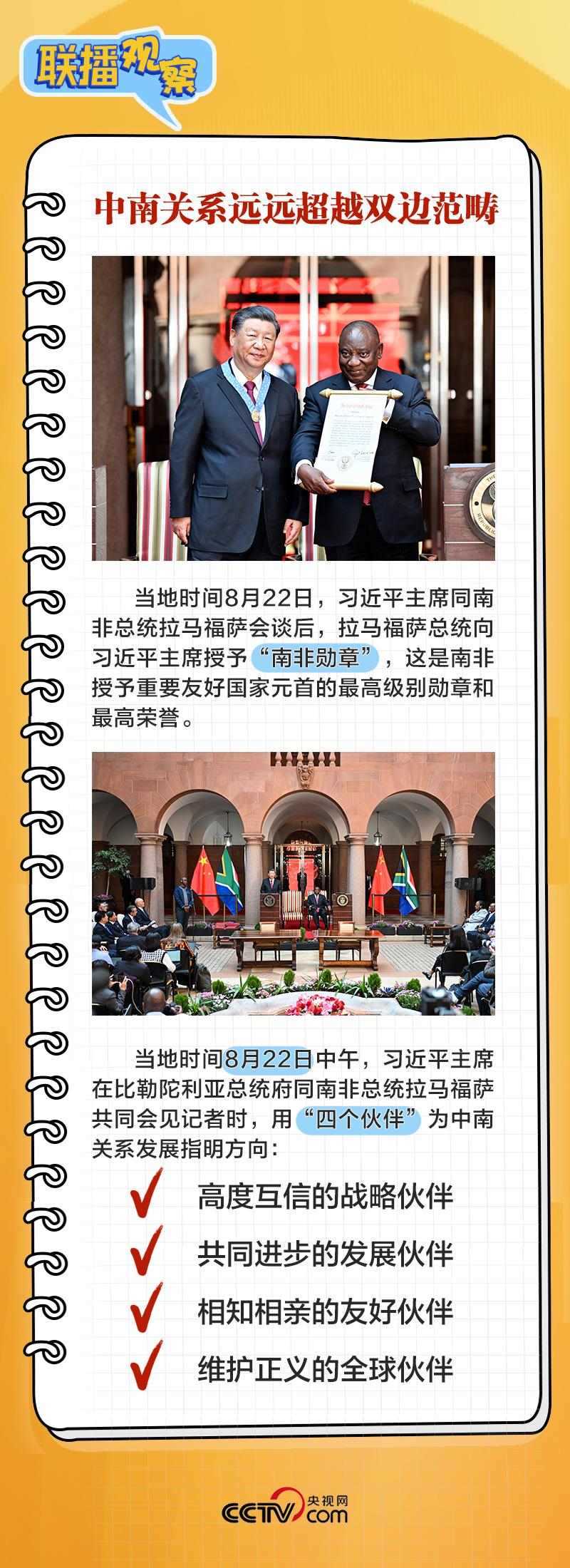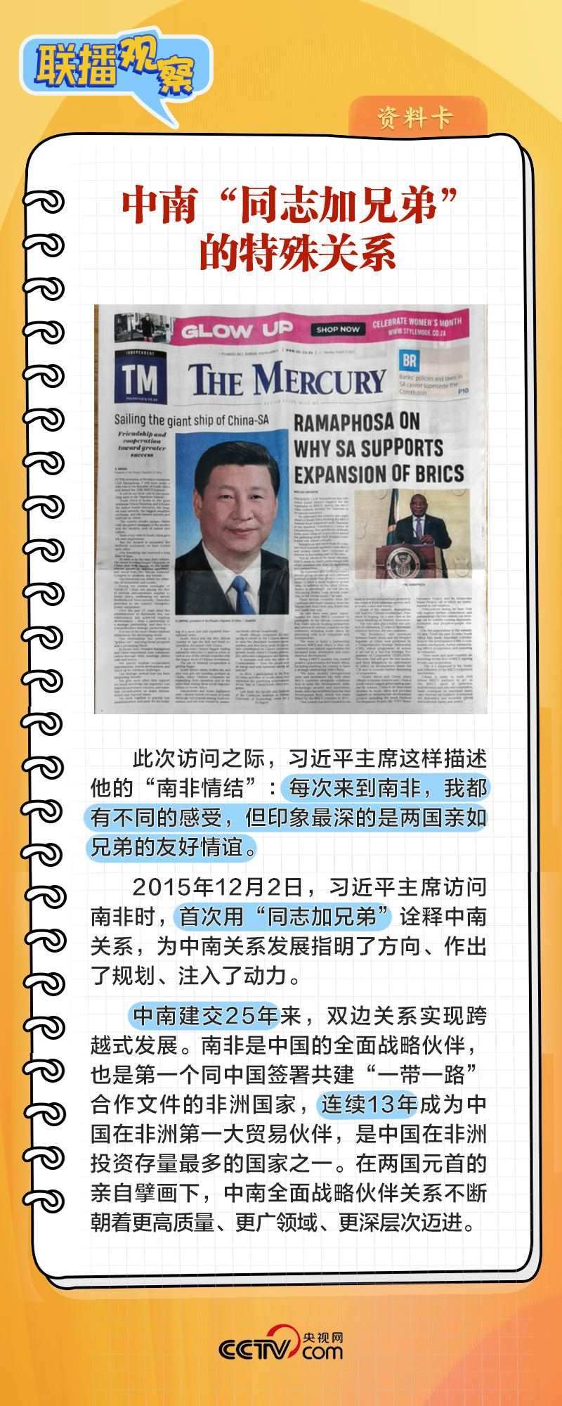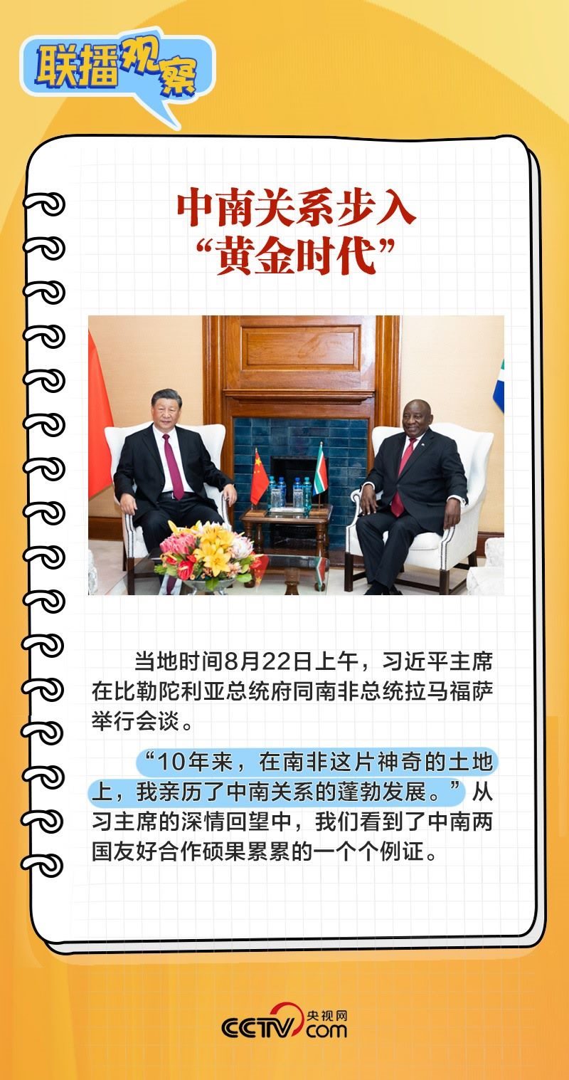 8月22日上午,在同南非總統(tǒng)拉馬福薩舉行會(huì)談時(shí),習(xí)主席表示:“中南關(guān)系之所以好、中南友誼之所以深,關(guān)鍵在于兩國(guó)兩黨在各自發(fā)展道路上休戚與共,結(jié)下了同志加兄弟的深厚友誼。”