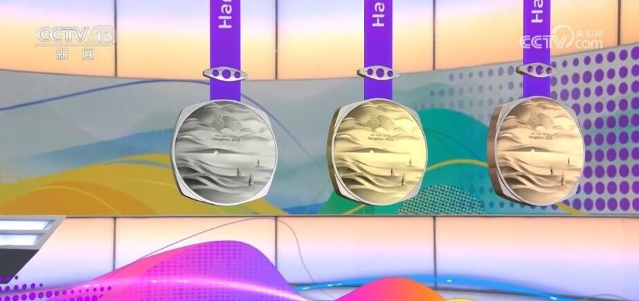 杭州亞運會獎牌名為“湖山”?!昂健睂⒘间疚幕姆叫斡耒蛨A形的獎?wù)氯跒橐惑w,正面用凸出的線條勾勒出“三面云山一面城”的杭城畫卷,湖水漣漪,山巒起伏。獎牌上方的束扣是一個帶有倒影的三孔橋,設(shè)計取自京杭大運河最南端的拱宸橋。一塊獎牌,將杭州的三處世界文化遺產(chǎn)——良渚、西湖、大運河都融入其中。