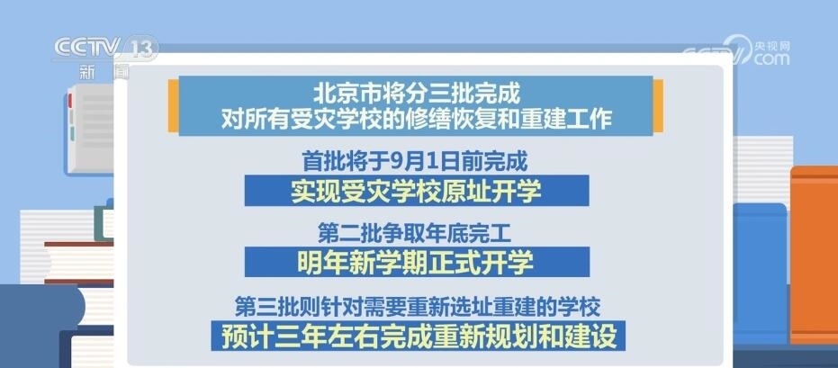 據(jù)了解,北京市將分三批完成對(duì)所有受災(zāi)學(xué)校的修繕恢復(fù)和重建工作。其中,首批將于9月1日前完成,實(shí)現(xiàn)受災(zāi)學(xué)校原址開學(xué)。第二批爭(zhēng)取年底完工,明年新學(xué)期正式開學(xué)。第三批則針對(duì)需要重新選址重建的學(xué)校,預(yù)計(jì)三年左右完成重新規(guī)劃和建設(shè)。