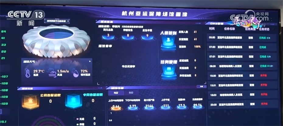 亞運(yùn)會(huì)場在技術(shù)創(chuàng)新上,會(huì)場可以滿足賽事期間數(shù)萬人同時(shí)使用4G、5G網(wǎng)絡(luò)收發(fā)視頻、圖片、撥打電話。當(dāng)局部用戶使用網(wǎng)絡(luò)數(shù)據(jù)上升的時(shí)候,場館內(nèi)的感知探針等設(shè)備會(huì)模擬和實(shí)時(shí)反饋上傳數(shù)據(jù),指揮中心屏幕上可以通過數(shù)據(jù)和紅橙黃綠四種顏色來判斷網(wǎng)速。工作人員能先于用戶,提前感知到網(wǎng)速變化并及時(shí)調(diào)度解決。