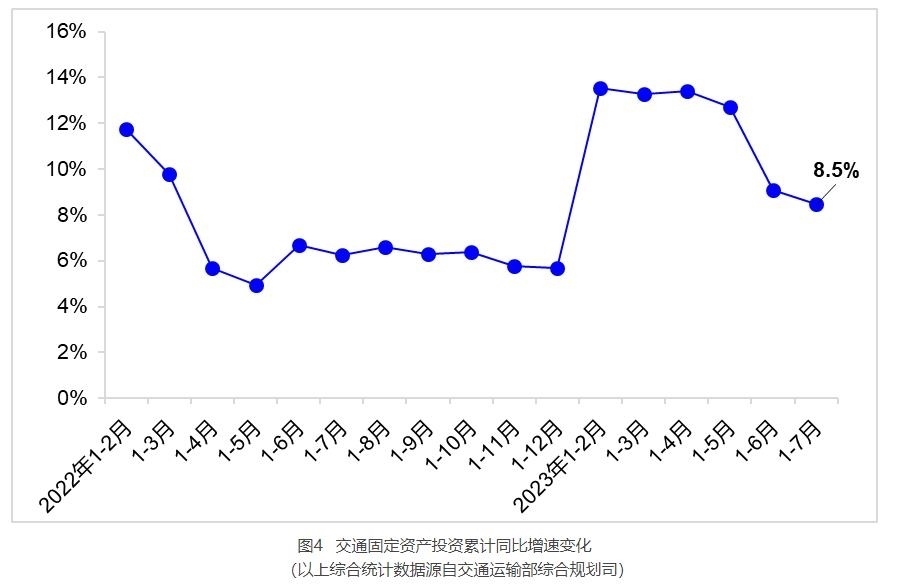 7月,完成交通固定資產投資3486億元,同比增長5.3%。其中,完成公路投資2548億元,同比增長3.9%;完成水運投資168億元,同比增長20.8%。