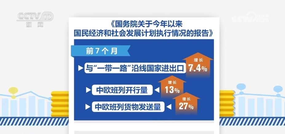 報(bào)告顯示,共建“一帶一路”持續(xù)推進(jìn)。鞏固拓展與重點(diǎn)共建國(guó)家和國(guó)際組織的務(wù)實(shí)合作,進(jìn)一步強(qiáng)化風(fēng)險(xiǎn)防控,前7個(gè)月與“一帶一路”沿線國(guó)家進(jìn)出口增長(zhǎng)7.4%,中歐班列開行量、貨物發(fā)送量分別增長(zhǎng)13%、27%。