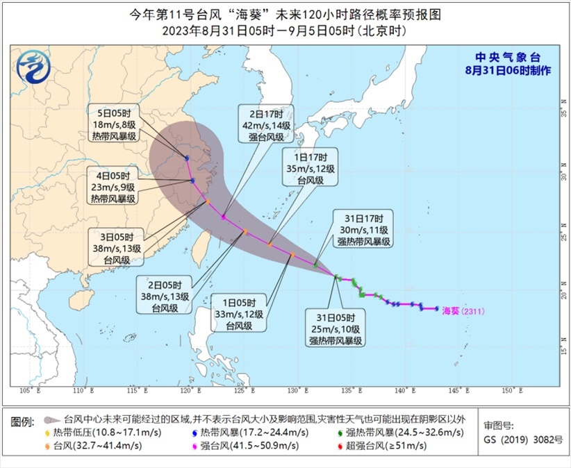 預(yù)計,“蘇拉”將以每小時10公里左右的速度向西北方向移動,逐漸向廣東東部一帶沿??拷?,強度緩慢減弱,并將于9月1日下午至夜間在廣東惠來到香港一帶沿海登陸(強臺風(fēng)級或超強臺風(fēng)級,45~52米/秒,14~16級),也有可能在廣東東部近岸海面向西偏南方向移動。中央氣象臺今晨升級發(fā)布臺風(fēng)紅色預(yù)警。