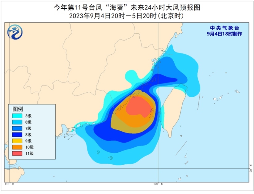 大風(fēng)預(yù)報(bào):9月4日20時(shí)至5日20時(shí),臺灣海峽、東海西南部、南海東北部以及福建沿海、廣東中東部沿海、臺灣島西部和北部沿海將有6-8級、陣風(fēng)9-10級大風(fēng),部分海域或地區(qū)的風(fēng)力有9-11級,陣風(fēng)12-13級。