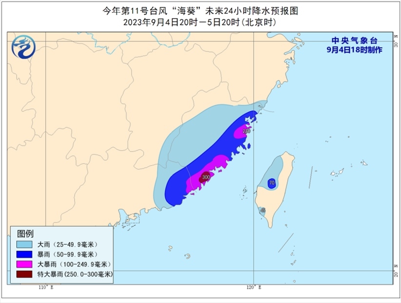 降水預(yù)報(bào):9月4日20時(shí)至5日20時(shí),福建大部、廣東東部、江西東南部、浙江東南部、臺灣島西部等地部分地區(qū)有大到暴雨,其中,福建東部、廣東東南部等地部分地區(qū)有大暴雨,局地特大暴雨(250-300毫米)。上述部分地區(qū)伴有短時(shí)強(qiáng)降水(最大小時(shí)降雨量30-50毫米,局地可超過70毫米),局地有雷暴大風(fēng)等強(qiáng)對流天氣。