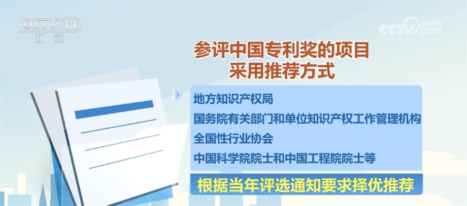 參評中國專利獎的項(xiàng)目采用推薦方式,由地方知識產(chǎn)權(quán)局、國務(wù)院有關(guān)部門和單位知識產(chǎn)權(quán)工作管理機(jī)構(gòu)、全國性行業(yè)協(xié)會、中國科學(xué)院院士和中國工程院院士等根據(jù)當(dāng)年評選通知要求擇優(yōu)推薦。經(jīng)過評審之后,在國家知識產(chǎn)權(quán)局政府網(wǎng)站公示評選結(jié)果,接受社會監(jiān)督。