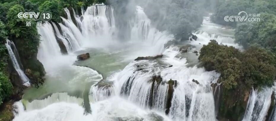 跟隨鏡頭,現(xiàn)在我們來到廣西崇左的德天跨國瀑布。它發(fā)源于廣西的歸春河,流向越南,又繞回廣西,最終在德天村遇斷崖形成瀑布。眼下,正值豐水期,德天跨國瀑布迎來最佳觀賞季。浩浩蕩蕩的河水從斷崖層層跌落,發(fā)出震撼的轟鳴聲,激起的水花騰空而上,讓人不禁感嘆大自然的神奇與美妙。