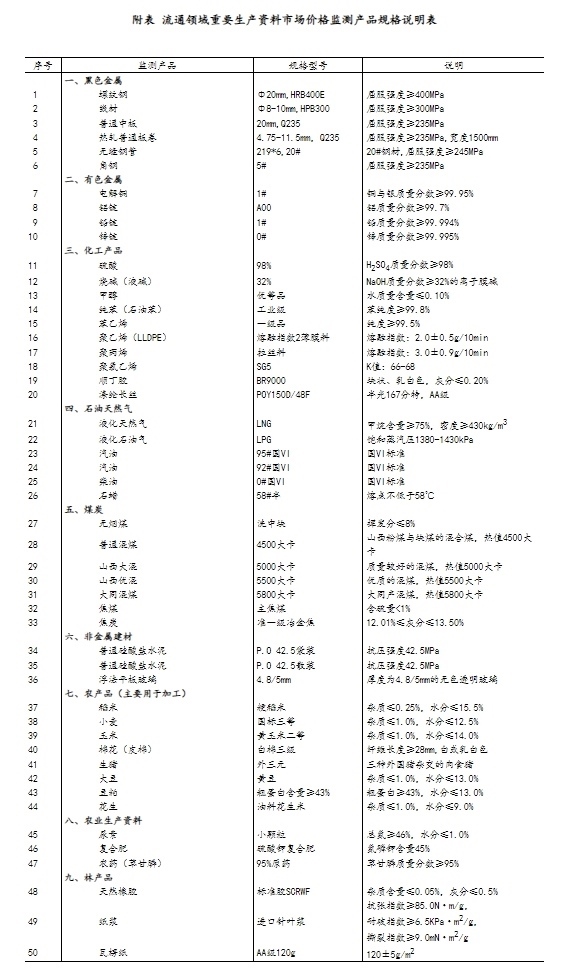 流通領(lǐng)域重要生產(chǎn)資料市場價(jià)格監(jiān)測內(nèi)容包括9大類50種產(chǎn)品的價(jià)格。類別與產(chǎn)品規(guī)格說明詳見附表。