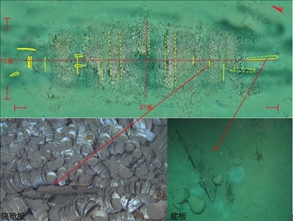 沉船遺址水深約30米,主體區(qū)域殘存有木質(zhì)船體和成摞擺放的船貨堆積,范圍約300平方米。考古發(fā)掘發(fā)現(xiàn),沉船船體殘長(zhǎng)約16.95米,最寬處保存約4.5米,殘存9道隔艙板和10個(gè)船艙,單層板結(jié)構(gòu),發(fā)現(xiàn)桅座、龍骨板、龍骨補(bǔ)強(qiáng)材以及舭龍骨等船體構(gòu)件。