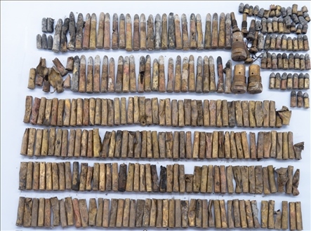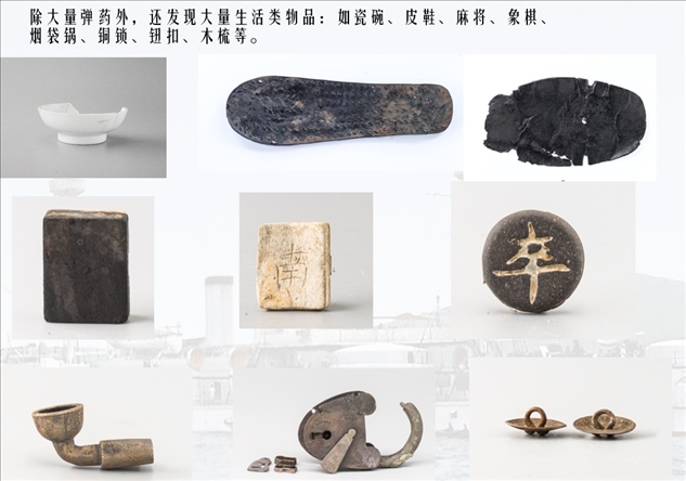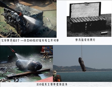 靖遠(yuǎn)艦于舯部發(fā)現(xiàn)2箱完好的37毫米哈乞開(kāi)司炮彈、艏部發(fā)現(xiàn)1枚210毫米主炮開(kāi)花彈。