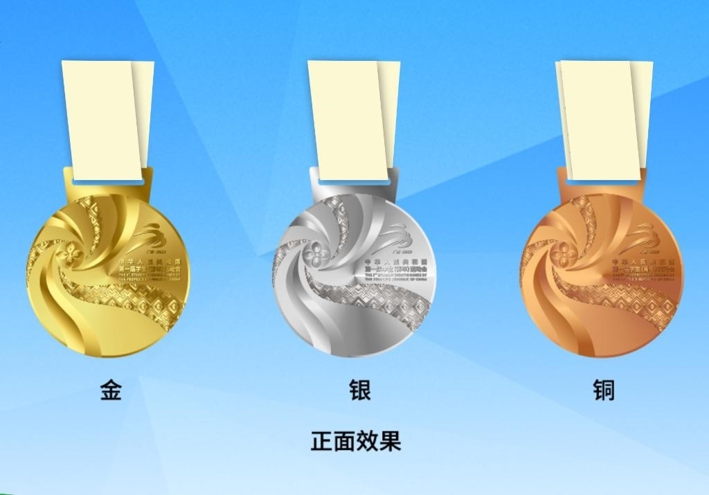 首屆學(xué)青會獎牌正面采用繡球、壯錦等廣西元素,以繡球?yàn)樵O(shè)計(jì)焦點(diǎn),通過壯錦飄帶向外綻放,如一朵盛開的鮮花,表達(dá)歡迎四方友人共赴學(xué)青盛會的美意;獎牌背面以廣西銅鼓鼓面為原型,中心太陽紋象征著年輕人的活力和熱情,四方配以圖騰鳥,有著吉祥的寓意;外圈環(huán)繞了學(xué)青會的英文名稱和銅鼓經(jīng)典紋飾云雷紋。獎牌整體寓意“團(tuán)結(jié)、活力、綻放”。
