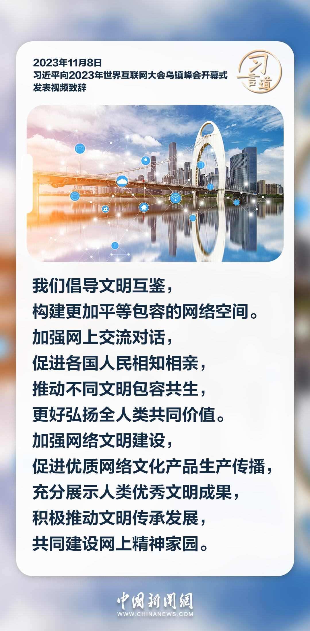 11月8日上午,國家主席習近平向2023年世界互聯(lián)網(wǎng)大會烏鎮(zhèn)峰會開幕式發(fā)表視頻致辭。習近平指出——