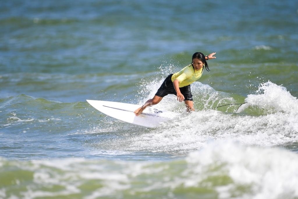 7月12日,第一屆全國學生(青年)運動會沖浪項目女子短板決賽在廣西北海市舉行。新華社記者 曹祎銘 攝