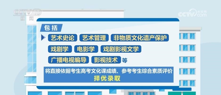 據(jù)了解,藝術(shù)類專業(yè)依據(jù)考生高考文化成績(jī)、專業(yè)考試成績(jī),參考綜合素質(zhì)評(píng)價(jià)進(jìn)行招生錄取。此次藝考改革一個(gè)重要的變化是,部分藝術(shù)類專業(yè)不再組織專業(yè)考試,包括藝術(shù)史論、藝術(shù)管理、非物質(zhì)文化遺產(chǎn)保護(hù)、戲劇學(xué)、電影學(xué)、戲劇影視文學(xué)、廣播電視編導(dǎo)、影視技術(shù)等,將直接依據(jù)考生高考文化課成績(jī)、參考考生綜合素質(zhì)評(píng)價(jià),擇優(yōu)錄取。