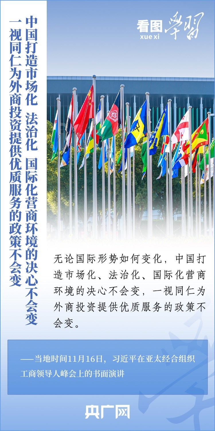 當地時間11月16日,國家主席習近平應邀出席亞太經合組織工商領導人峰會并發(fā)表書面演講。習主席深刻總結了亞太經濟合作30年來非凡成就和啟示,對亞太合作下一個30年將走向何方這一新的時代之問提出中國答案,重申“中國打造市場化、法治化、國際化營商環(huán)境的決心不會變,一視同仁為外商投資提供優(yōu)質服務的政策不會變”,向全球工商界發(fā)出邀請,歡迎“積極參與中國式現(xiàn)代化進程,共享中國高質量發(fā)展帶來的巨大機遇!”一起來學習。