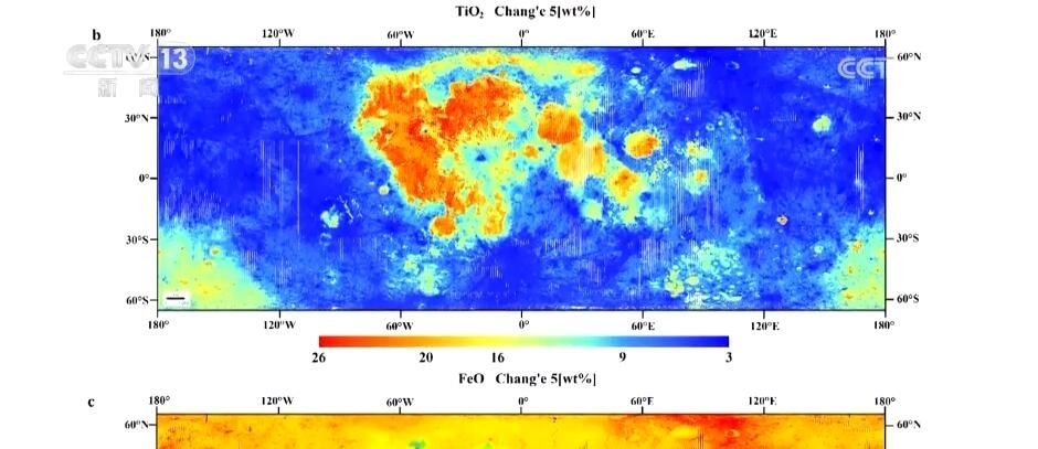 吉林大學(xué)地球科學(xué)學(xué)院教授 楊晨:之前我們主要采用的月球表面元素成分圖,主要是基于美國(guó)和蘇聯(lián)的樣品數(shù)據(jù),主要反映的是月球30億年前的演變。我國(guó)采樣的嫦娥五號(hào)數(shù)據(jù),可以反映年輕的、20億年以來的月球歷史。我們基于嫦娥五號(hào)樣品數(shù)據(jù),獲得了月球表面六種主要元素在月球上的分布情況。其中,紅色部分代表元素含量相對(duì)較高,比如鈦和鐵。我們發(fā)現(xiàn)在月海附近(區(qū)域),它們的含量相對(duì)豐富,這兩種元素對(duì)于判定年輕月海玄武巖具有重要意義。