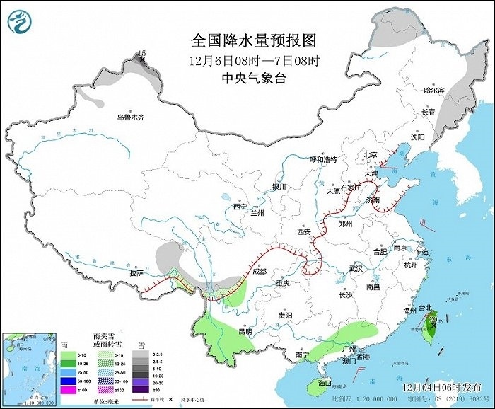 12月4日08時至5日08時,新疆北部、甘肅河西、青海南部、西藏中東部和南部、川西高原北部等地部分地區(qū)有小到中雪或雨夾雪,其中,新疆阿勒泰山區(qū)和伊犁河谷、西藏南部等地部分地區(qū)有大到暴雪,局地大暴雪(20~22毫米)。湖南南部、江西南部、浙江大部、福建、廣東東部和北部、廣西西部、云南南部、海南島、臺灣島等地部分地區(qū)有小到中雨,其中,臺灣島中南部等地部分地區(qū)有大雨(25~40毫米)。新疆北疆北部、內(nèi)蒙古大部、甘肅河西等地部分地區(qū)有4~6級風(fēng)(見圖1)。