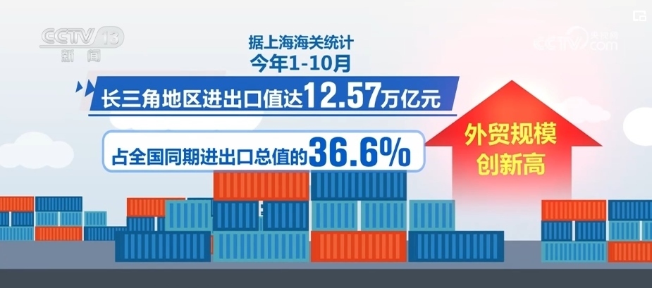 據(jù)上海海關(guān)統(tǒng)計(jì),2023年1—10月,長(zhǎng)三角地區(qū)進(jìn)出口值達(dá)12.57萬(wàn)億元,占全國(guó)同期進(jìn)出口總值的36.6%,外貿(mào)規(guī)模創(chuàng)新高。