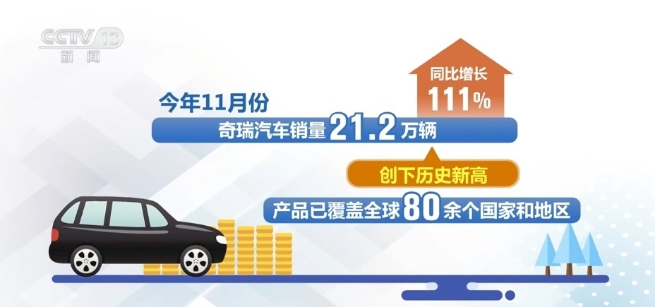 最新數(shù)據(jù)顯示,2023年11月份,奇瑞汽車(chē)銷(xiāo)量21.2萬(wàn)輛,同比增長(zhǎng)111%,創(chuàng)下歷史新高,產(chǎn)品已覆蓋全球80余個(gè)國(guó)家和地區(qū)。