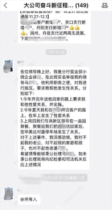 ·江蘇銀行鎮(zhèn)江分行回應女員工舉報被領導施壓發(fā)生性關系:已免去馬某團隊經(jīng)理職務。