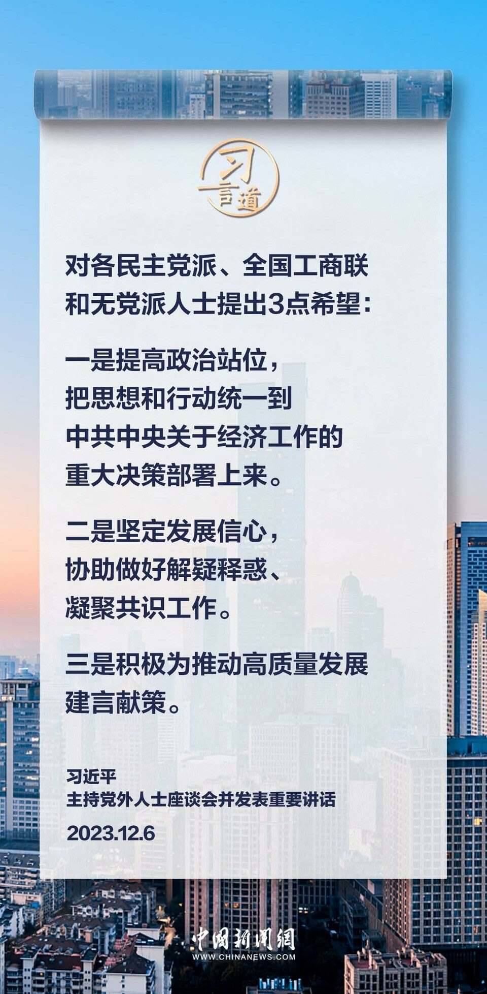 12月6日,中共中央在中南海召開(kāi)黨外人士座談會(huì),就今年經(jīng)濟(jì)形勢(shì)和明年經(jīng)濟(jì)工作聽(tīng)取各民主黨派中央、全國(guó)工商聯(lián)負(fù)責(zé)人和無(wú)黨派人士代表的意見(jiàn)和建議。中共中央總書(shū)記習(xí)近平主持座談會(huì)并發(fā)表重要講話。