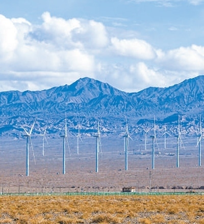 甘肅酒泉玉門市,廣袤戈壁上的風(fēng)機(jī)。