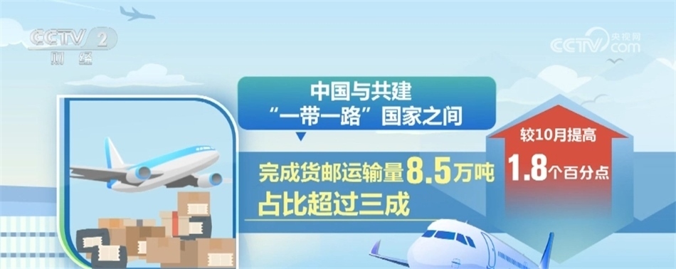 國(guó)際航線中,我國(guó)航空公司在中國(guó)至歐洲航線完成貨郵運(yùn)輸量最大,達(dá)10.9萬(wàn)噸,占比近四成;中國(guó)至亞洲其他國(guó)家航線貨運(yùn)恢復(fù)水平最高;中國(guó)至北美航線貨運(yùn)繼續(xù)恢復(fù),完成6.2萬(wàn)噸;中國(guó)與共建“一帶一路”國(guó)家之間完成貨郵運(yùn)輸量8.5萬(wàn)噸,占比超過三成,較10月提高1.8個(gè)百分點(diǎn)。
