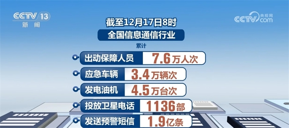 據(jù)了解,截至12月17日8時,全國信息通信行業(yè)累計出動保障人員7.6萬人次、應(yīng)急車輛3.4萬輛次、發(fā)電油機(jī)4.5萬臺次、投放衛(wèi)星電話1136部、發(fā)送預(yù)警短信1.9億條。全國通信網(wǎng)絡(luò)整體運(yùn)行平穩(wěn),累計3053座基站退服,已修復(fù)2933座,未發(fā)生鄉(xiāng)鎮(zhèn)級通信全阻。