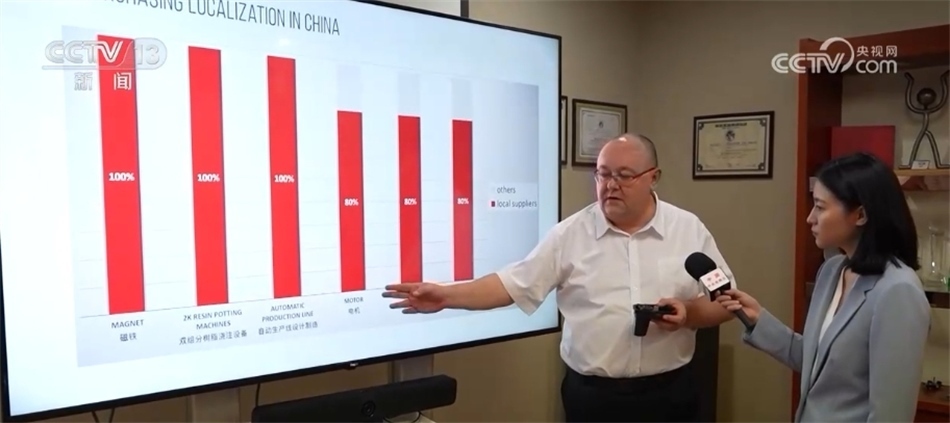 艾菲汽車零部件亞太區(qū)首席執(zhí)行官 埃里克·勒邁爾:從這張圖表中可以看出,就電機(jī)而言,我們使用的電機(jī)有80%來自當(dāng)?shù)毓?yīng)商,磁鐵則100%來自當(dāng)?shù)毓?yīng)商,當(dāng)?shù)毓?yīng)商質(zhì)量好、價(jià)格低。