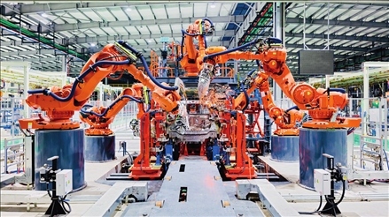 浙江清華長(zhǎng)三角研究院新能源汽車(chē)研發(fā)中心的新能源汽車(chē)制造焊裝線(2021年6月攝)。 浙江清華長(zhǎng)三角研究院供圖
